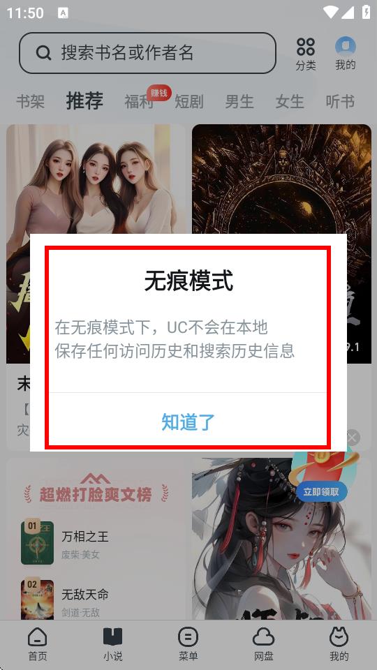 3、點擊后會彈出關于無痕模式的說明,了解相關信息后,即成功開啟無痕模式。