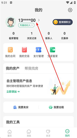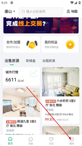 1、打開(kāi)千家找房,點(diǎn)擊底部導(dǎo)航欄最右側(cè)我的選項(xiàng)。