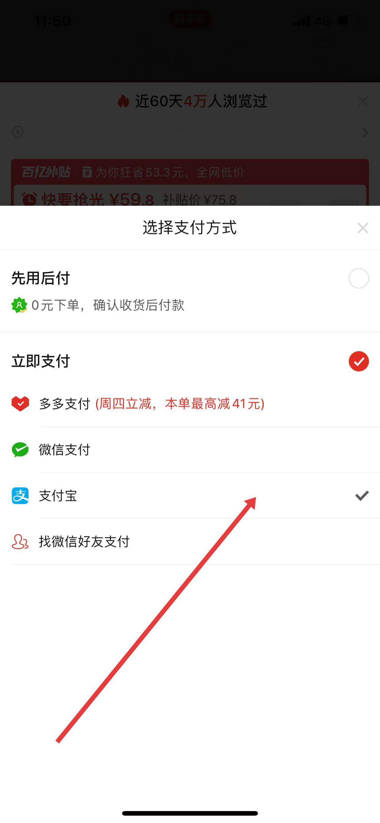 2、在彈出的選擇支付方式界面中,找到支付寶的選項(xiàng),點(diǎn)擊其左側(cè)的圓圈進(jìn)行勾選。