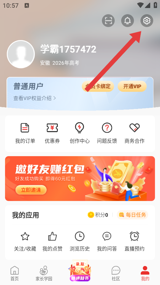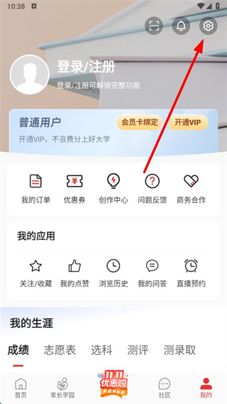 1、在優(yōu)志愿我的頁面,點(diǎn)擊右上角的設(shè)置圖標(biāo),進(jìn)入系統(tǒng)設(shè)置界面。