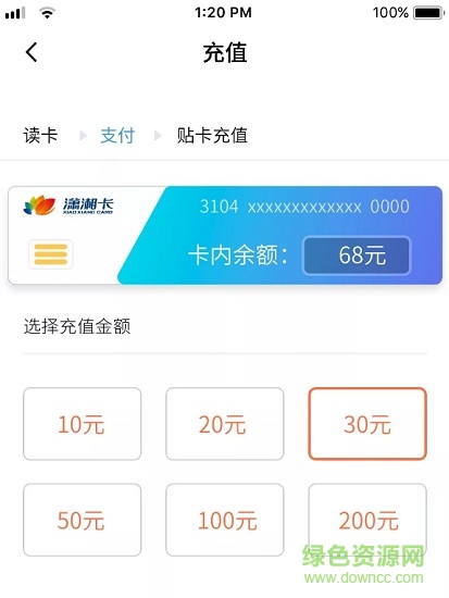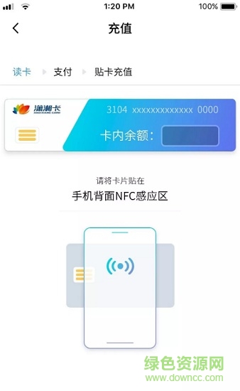 1、進(jìn)入"充值"模塊,將瀟湘卡貼在手機(jī)NFC感應(yīng)位置進(jìn)行讀卡。