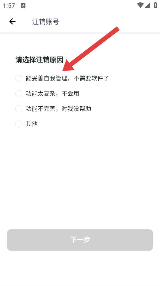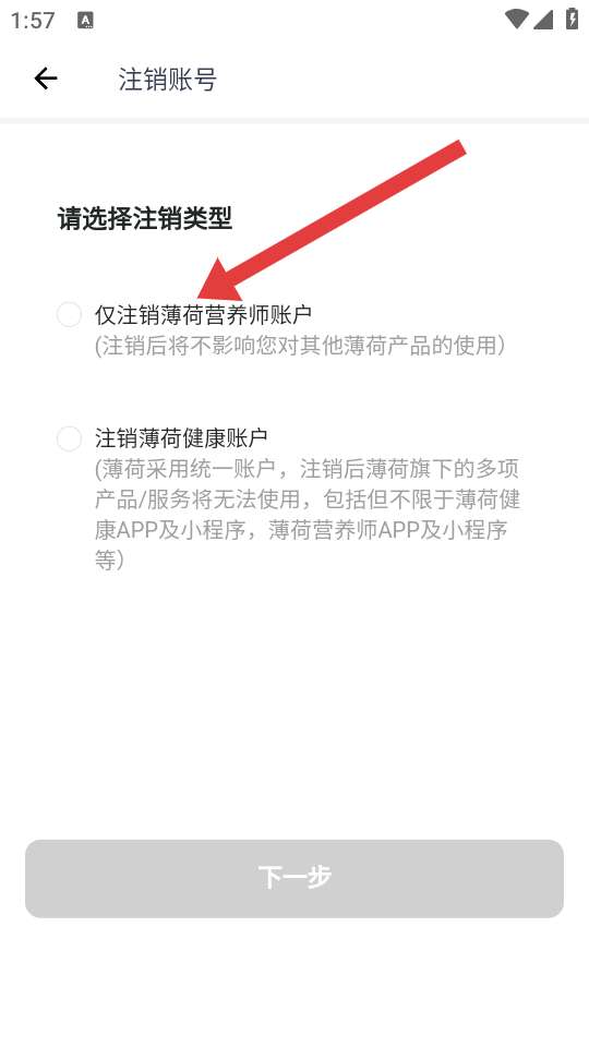 3、在注銷賬號頁面,選擇注銷類型如僅注銷薄荷營養(yǎng)師賬戶,然后點擊下一步。