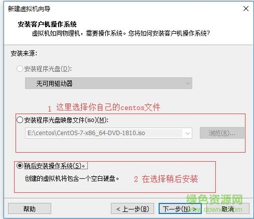 3.這里注意了,第一步:選擇好剛剛你的centos系統(tǒng)鏡像系統(tǒng)文件位置 ,第二步:在選擇稍后安裝操作系統(tǒng)