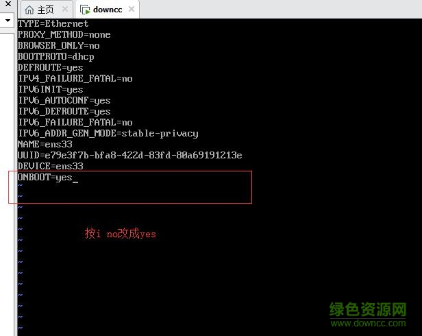2.輸入vi /etc/sysconfig/network-scripts/ifcfg-ens33 找到ONBOOT改成yes,按下字母按鍵‘i’就能修改文件了,修改完成之后輸入:wq然后按下enter鍵編輯成功
