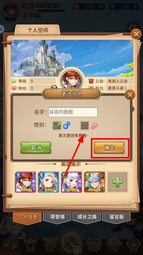 3、在更改信息界面里,找到性別選項(xiàng),點(diǎn)擊想要更換的性別圖標(biāo),選擇完成后點(diǎn)擊確定按鈕,首次更改是免費(fèi)的。