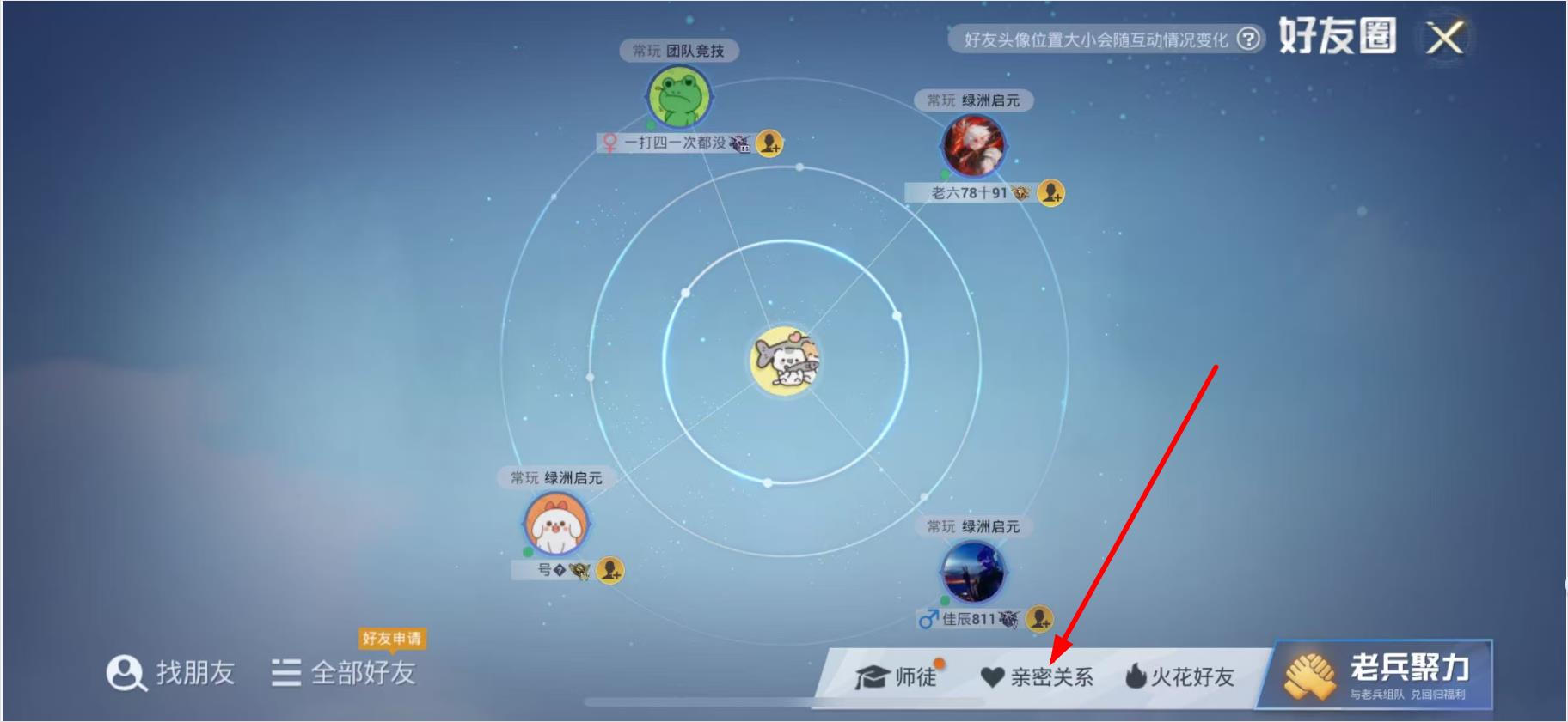 2、在好友界面中,點(diǎn)擊下方的親密關(guān)系選項(xiàng),進(jìn)入親密關(guān)系設(shè)置頁面。