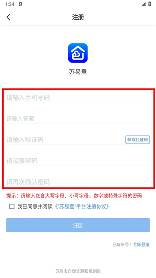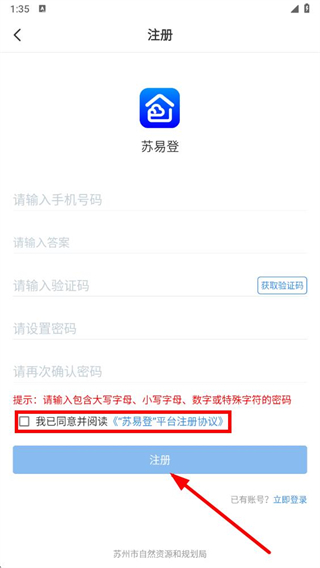 4、勾選我已同意并閱讀蘇易登平臺注冊協(xié)議,點擊注冊按鈕即可完成賬號注冊。