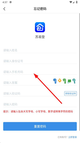 3、在界面里,依次填寫信息,完成驗證后設置新密碼,點擊重置密碼按鈕,即可完成登錄密碼的重置操作。