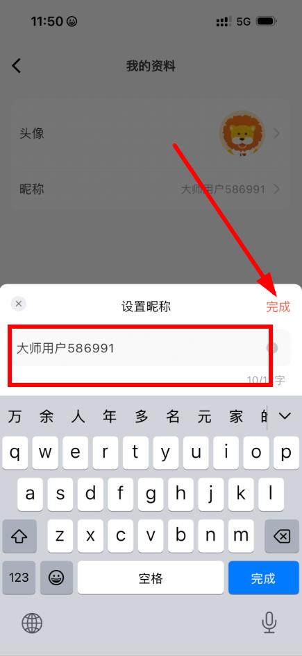 4、在彈出的設(shè)置昵稱輸入框中,輸入新的昵稱,然后點(diǎn)擊完成按鈕,即可完成名字修改。