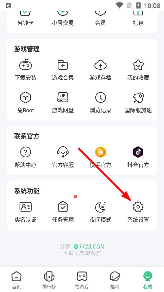 1、打開7723游戲盒APP,點(diǎn)擊右下角我的進(jìn)入個(gè)人中心頁面,下滑找到系統(tǒng)功能板塊。