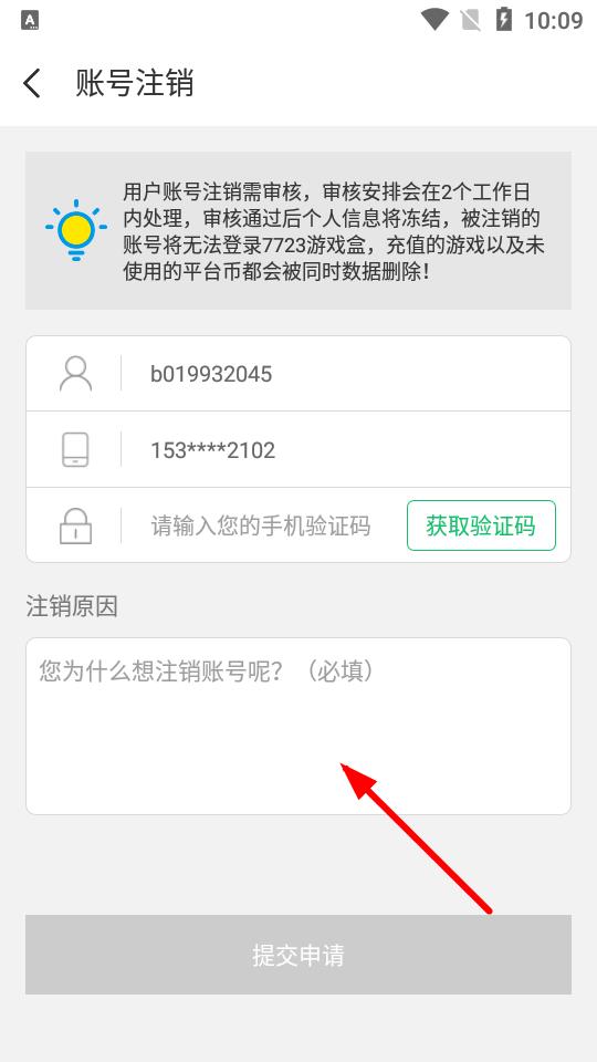 3、在賬號(hào)注銷頁面,輸入手機(jī)驗(yàn)證碼,并在注銷原因欄填寫注銷理由,完成后點(diǎn)擊提交申請,等待審核處理即可。