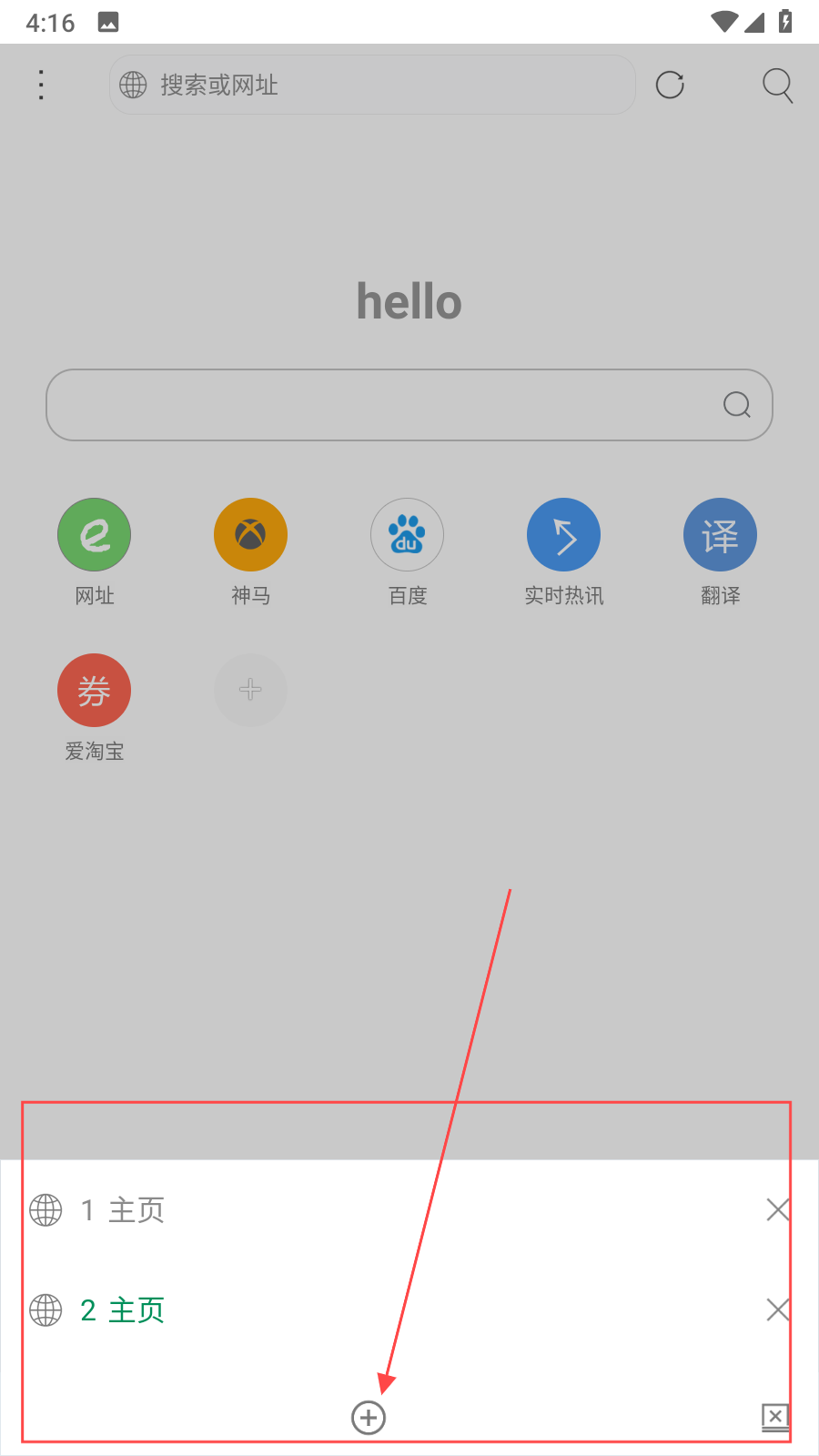 2、點(diǎn)擊底部功能欄新建標(biāo)簽頁(yè)按鈕+號(hào),即可快速打開(kāi)新的標(biāo)簽頁(yè),在新標(biāo)簽頁(yè)中可輸入網(wǎng)址或進(jìn)行搜索操作,方便同時(shí)瀏覽多個(gè)不同網(wǎng)頁(yè)內(nèi)容。
