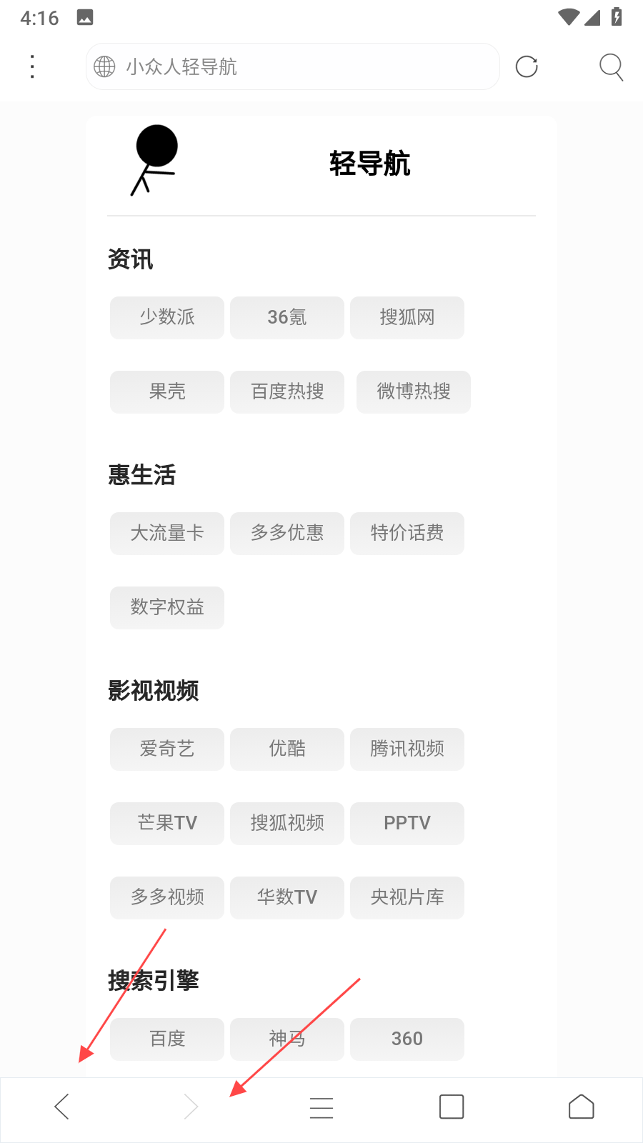 3、通過(guò)底部功能欄的前進(jìn)和后退按鈕,能在瀏覽過(guò)的網(wǎng)頁(yè)之間快速切換,點(diǎn)擊前進(jìn)可跳轉(zhuǎn)到之后訪問(wèn)的頁(yè)面,點(diǎn)擊后退則返回之前瀏覽的頁(yè)面,提升網(wǎng)頁(yè)瀏覽的便捷性。