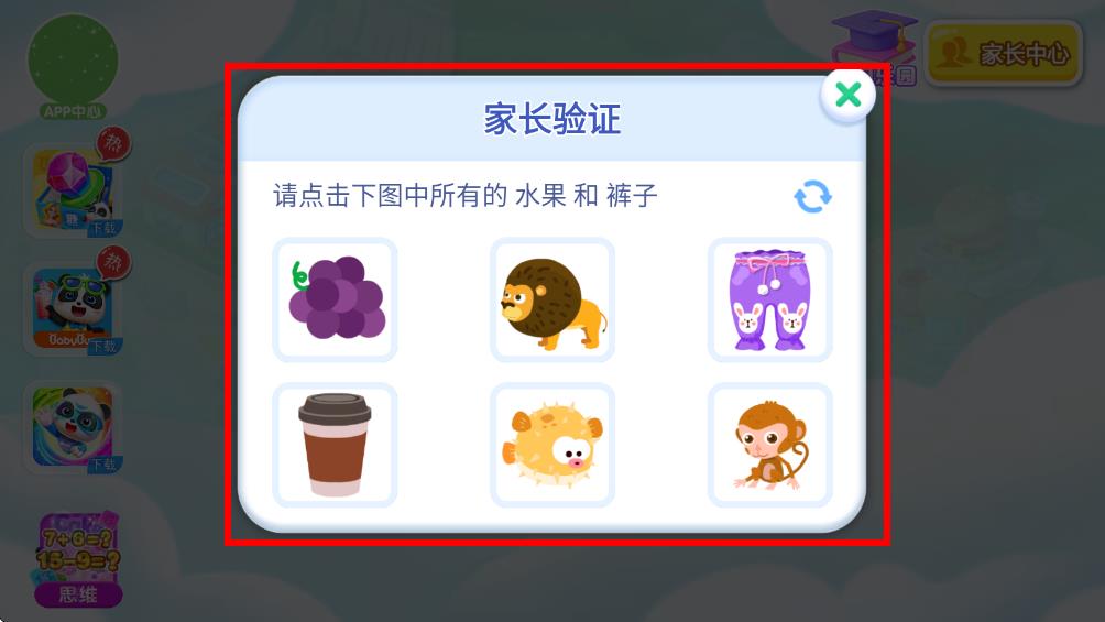 2、點擊家長中心后,會彈出家長驗證窗口,按照要求點擊圖中所有的水果和褲子完成驗證流程。