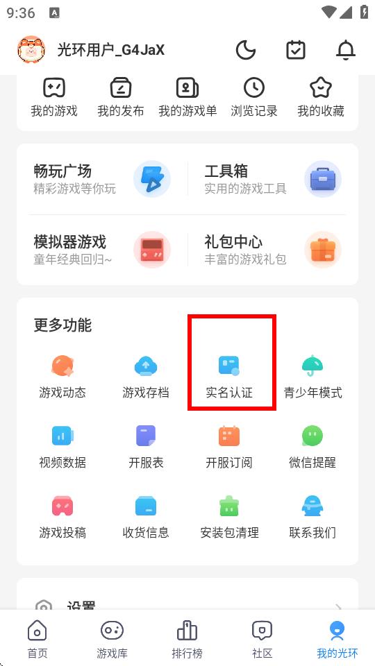 2、在個(gè)人界面中找到更多功能板塊,點(diǎn)擊其中的實(shí)名認(rèn)證按鈕。