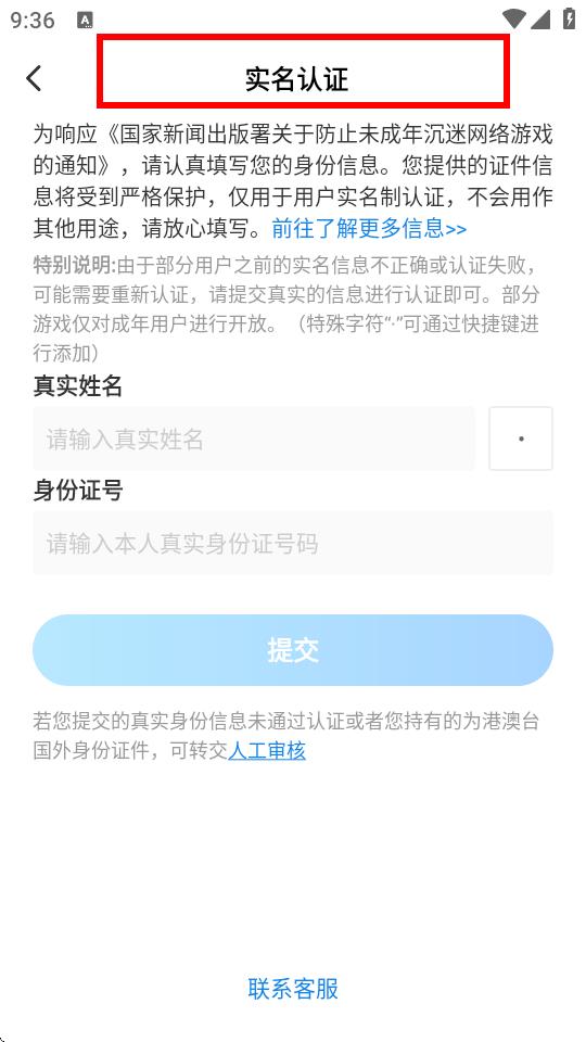 3、進(jìn)入實(shí)名認(rèn)證頁(yè)面后,按要求輸入真實(shí)姓名及本人真實(shí)身份證號(hào)碼,點(diǎn)擊提交完成實(shí)名認(rèn)證。