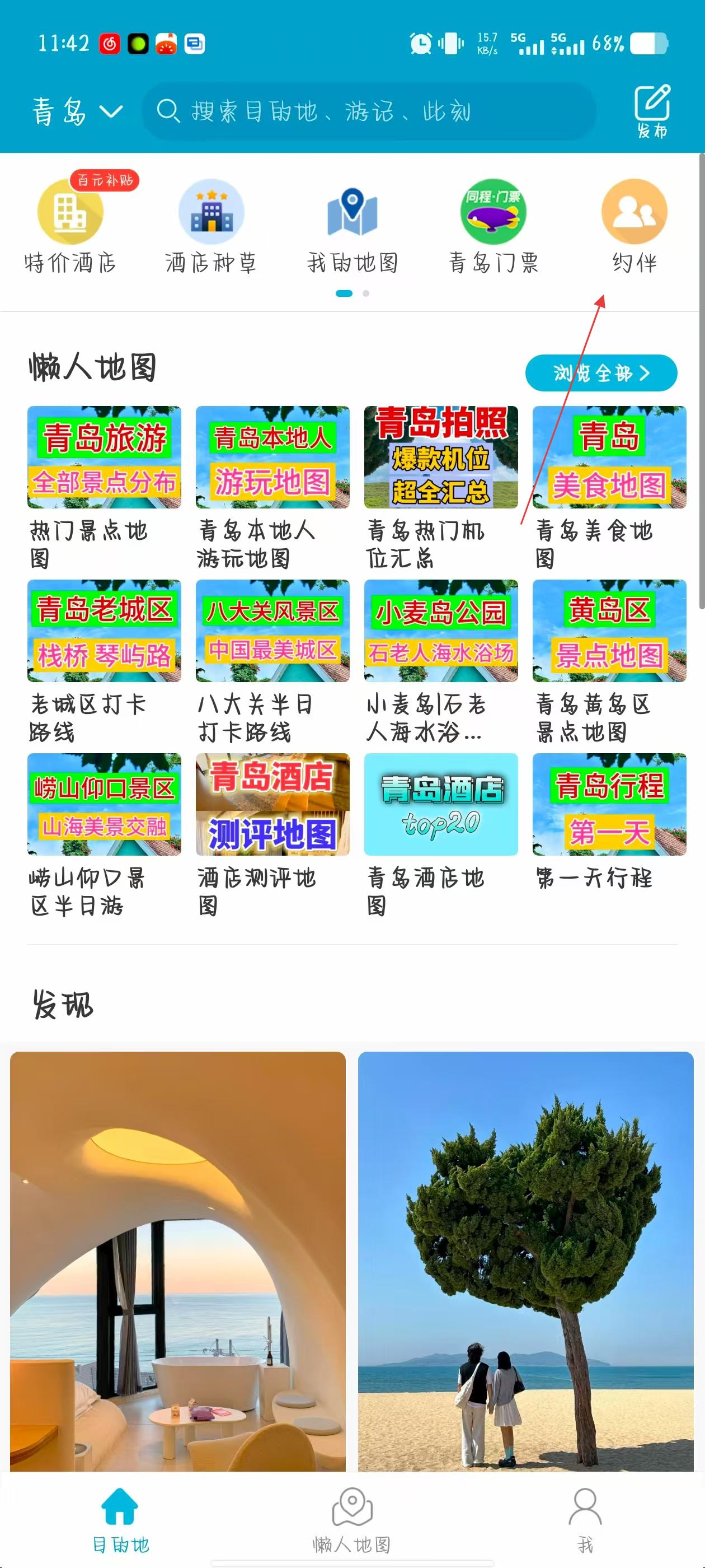 1、打開十六番旅行APP,在首頁點擊右上角約伴圖標(biāo)。