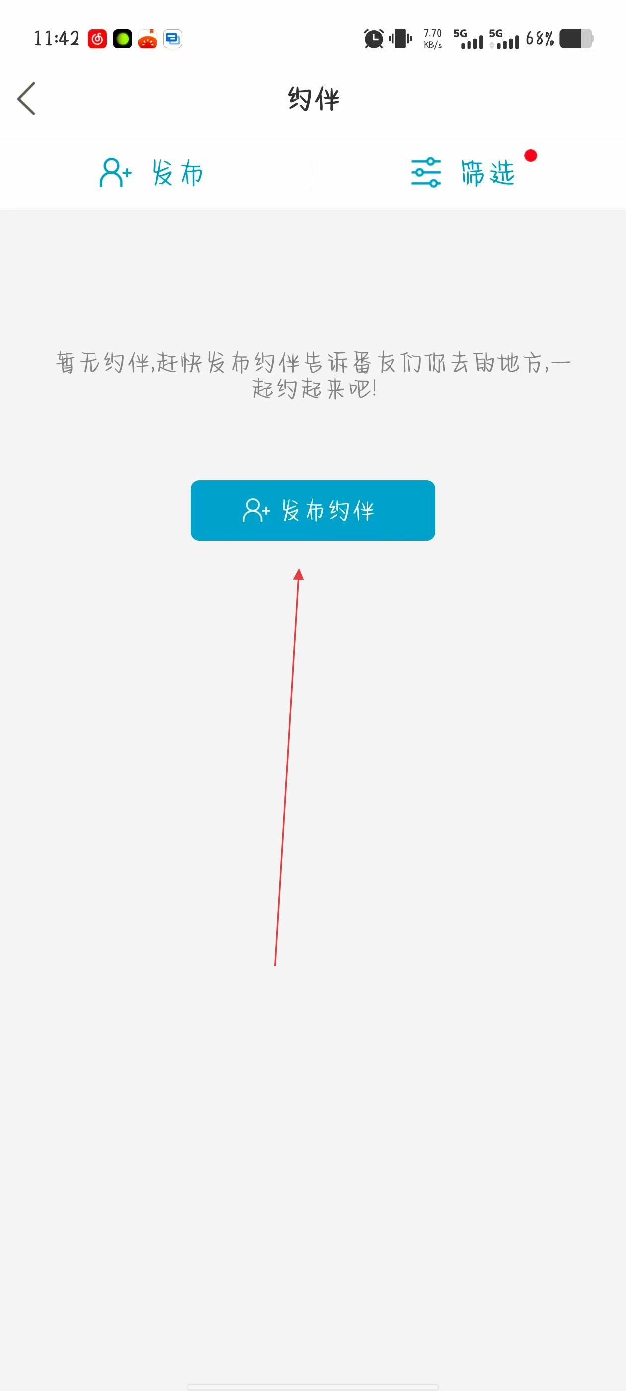 2、進(jìn)入約伴頁面后,點擊藍(lán)色的發(fā)布約伴按鈕。