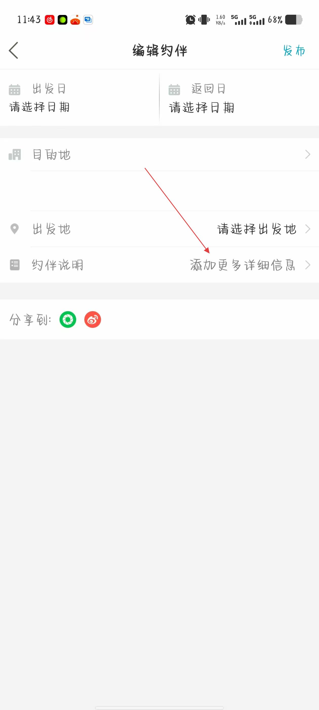 3、在編輯約伴頁面,依次選擇出發(fā)日、返回日、目的地、出發(fā)地,并點擊約伴說明右側(cè)的添加更多詳細(xì)信息。