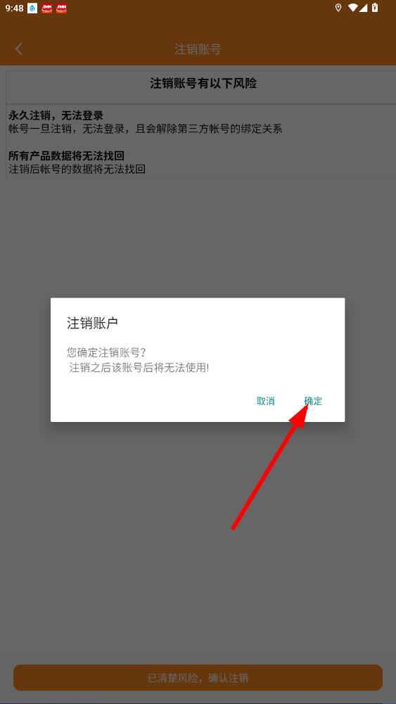 4、閱讀注銷賬號的風險提示后,在彈出的確認窗口中點擊確定,即可完成賬號注銷。