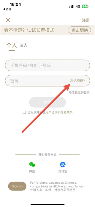 3、在登錄頁面中,點擊忘記密碼選項進入忘記密碼頁面。