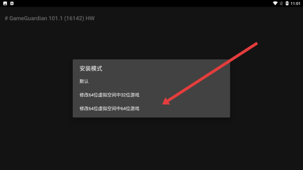 1、安裝GameGuardian時,選擇修改64位虛擬空間中64位游戲的安裝模式,適配對應(yīng)架構(gòu)游戲的修改需求。