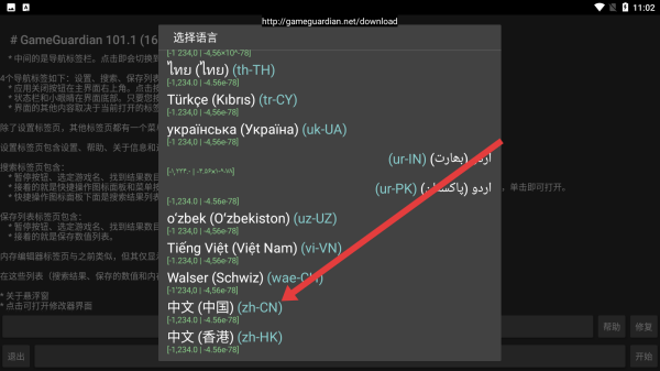 2、在GameGuardian語言選擇界面,點擊中文(中國)(zh-CN),將應(yīng)用語言設(shè)為簡體中文,方便操作。