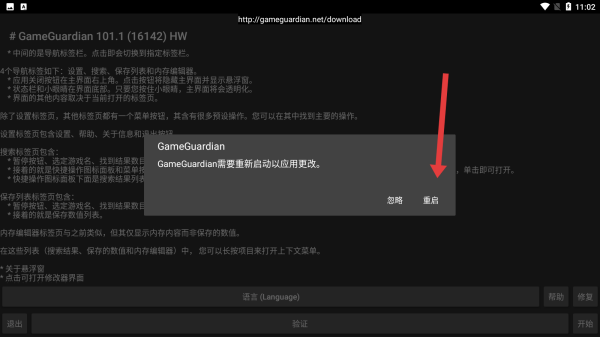 3、當GameGuardian提示需重啟時,點擊重啟按鈕,重啟應(yīng)用以生效語言等設(shè)置變更。