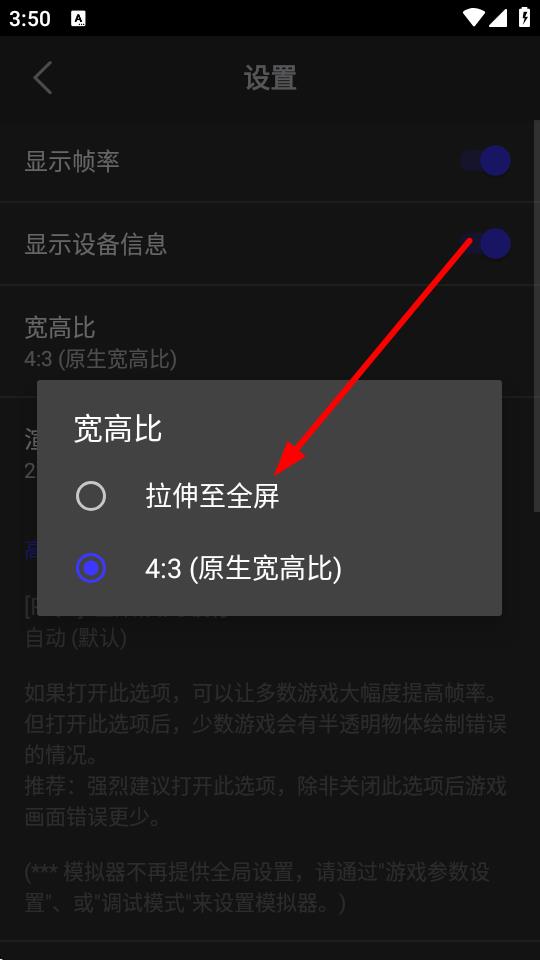 4、點擊后會彈出寬高比選擇菜單,選擇拉伸至全屏選項,即可將模擬器畫面設(shè)置為全屏。