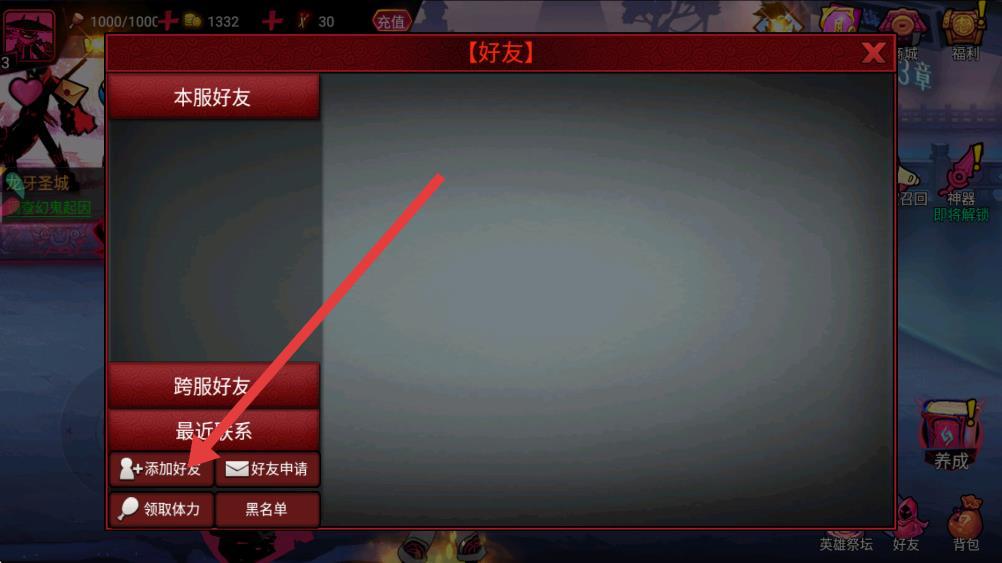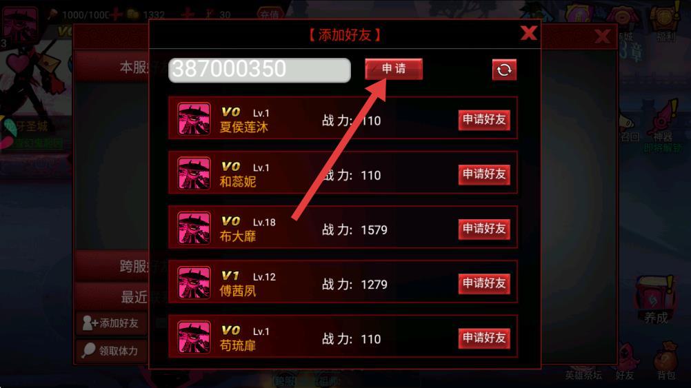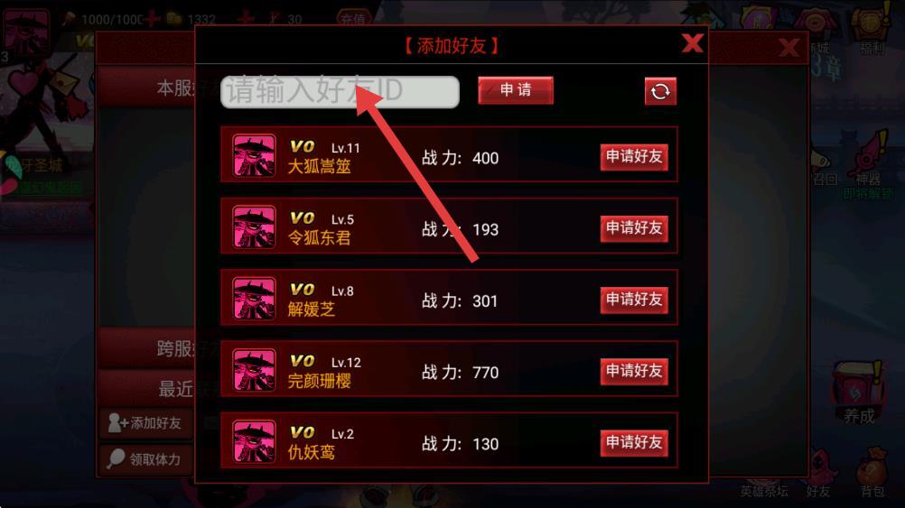4、輸入好友ID后,點擊輸入框右側(cè)的申請按鈕,待對方同意后,即可成為游戲好友。