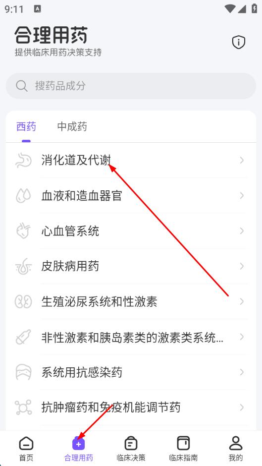 2、在“合理用藥”頁面,選擇藥品所屬類別,比如消化道及代謝。