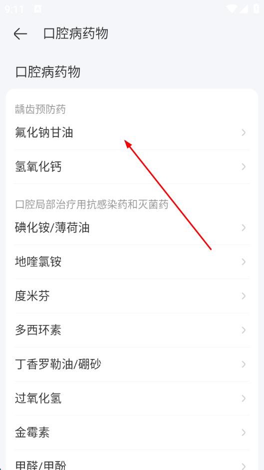 4、在細分藥物分類里,點擊想要查看的具體藥品,例如氟化鈉甘油。