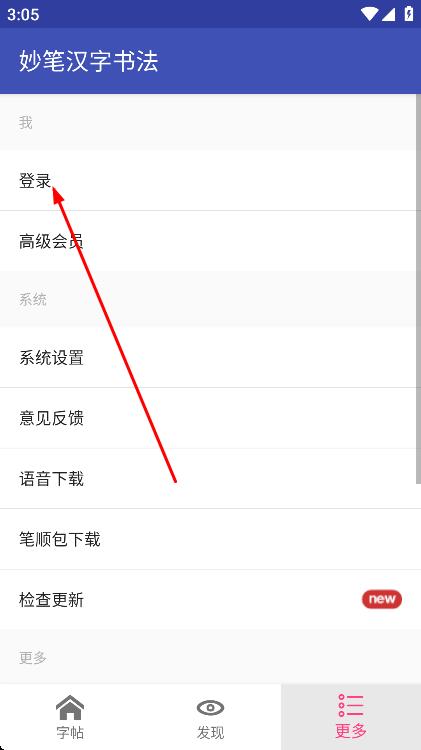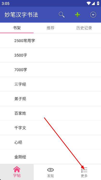 1、打開妙筆漢字書法,點擊底部導(dǎo)航欄中的更多。