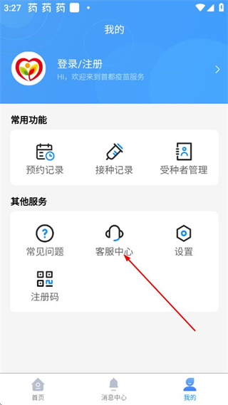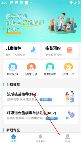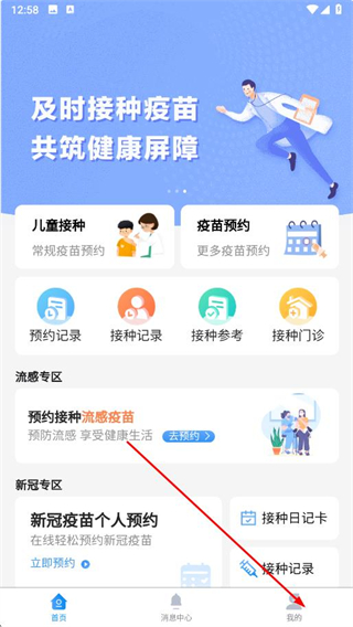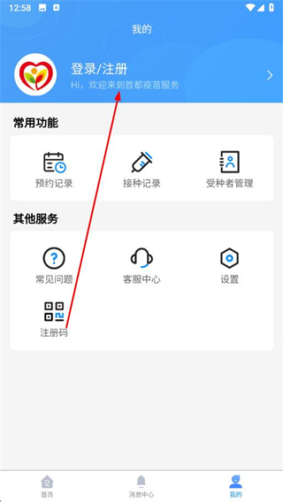 1、在首都疫苗服務(wù)App首頁點(diǎn)擊底部的我的選項(xiàng),進(jìn)入個(gè)人中心頁面。