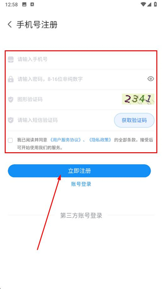 4、輸入手機(jī)號(hào)、密碼、圖形驗(yàn)證碼、驗(yàn)證碼,勾選服務(wù)協(xié)議,點(diǎn)擊立即注冊(cè)。