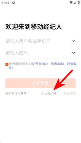 1、打開(kāi)移動(dòng)經(jīng)紀(jì)人APP,在登錄界面點(diǎn)擊忘記用戶(hù)名。