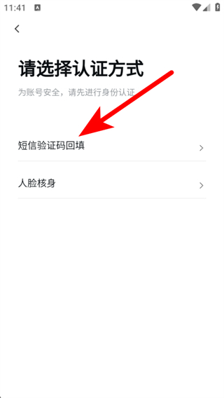 2、進(jìn)入認(rèn)證方式選擇頁(yè)面,點(diǎn)擊短信驗(yàn)證碼回填的按鈕。