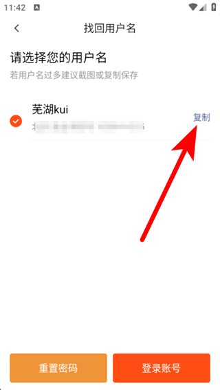 4、進(jìn)入找回用戶(hù)名頁(yè)面,選擇對(duì)應(yīng)的用戶(hù)名,點(diǎn)擊復(fù)制即可獲取用戶(hù)名。
