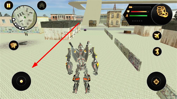 1、左下角搖桿可操控角色移動,無論是機器人形態(tài)在地面行走,還是戰(zhàn)機形態(tài)在空中飛行,通過搖桿都能靈活調(diào)整移動方向。