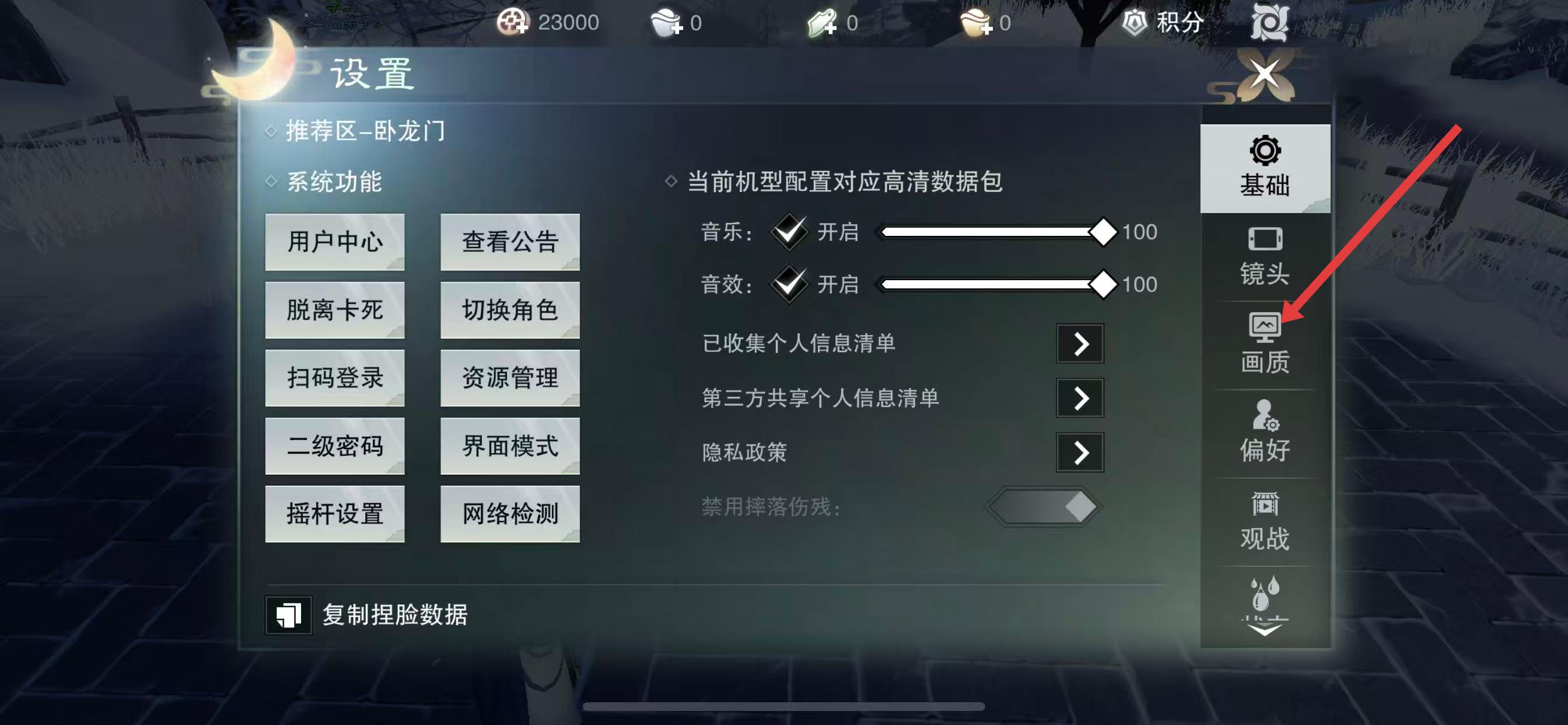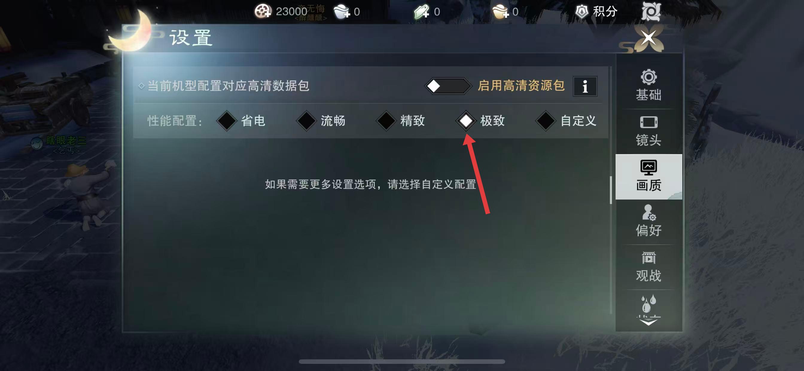 3、找到性能配置選項,想要更清晰的畫質(zhì),可以選擇極致模式。