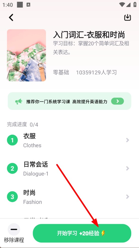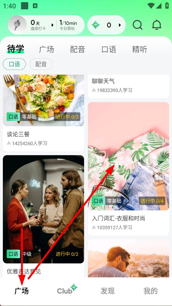1、打開英語流利說APP,進入廣場頁面,選擇想要學習的口語課程,如入門詞匯-衣服和時尚。