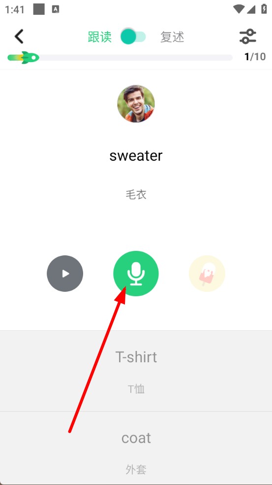 3、在學習界面中,開啟跟讀模式,點擊麥克風圖標,根據(jù)屏幕上出現(xiàn)的單詞或句子進行跟讀練習。