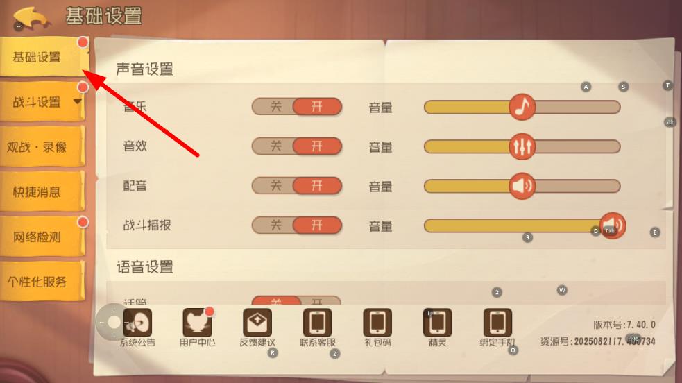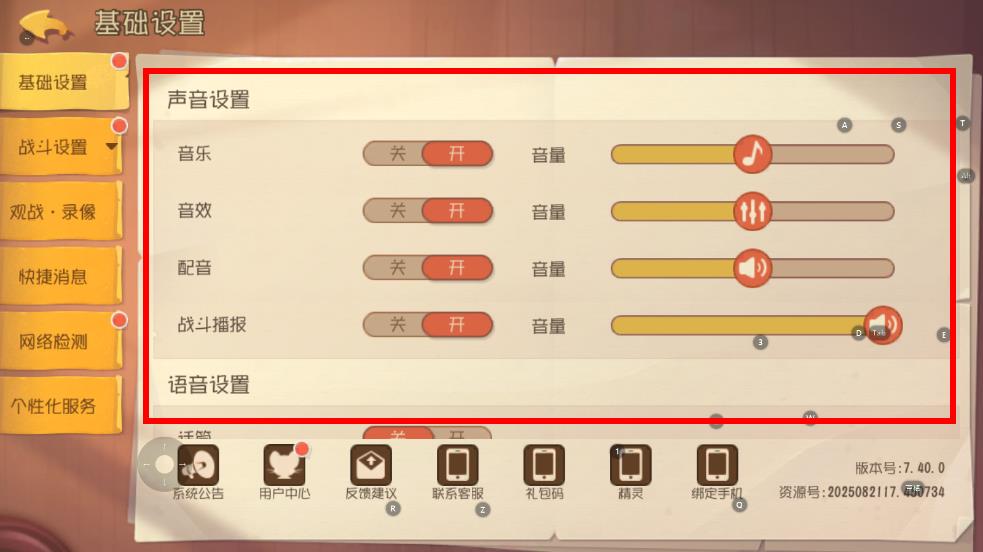 3、在基礎(chǔ)設(shè)置頁面的聲音設(shè)置板塊,找到音樂、音效、配音、戰(zhàn)斗播報選項,點擊對應(yīng)選項的開關(guān)按鈕,將其狀態(tài)切換為關(guān),即可關(guān)閉相應(yīng)的游戲聲音。