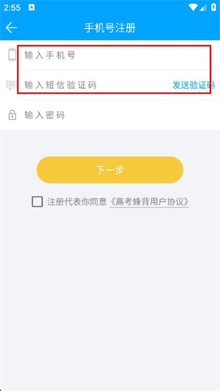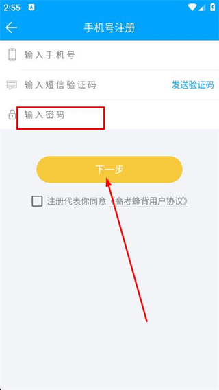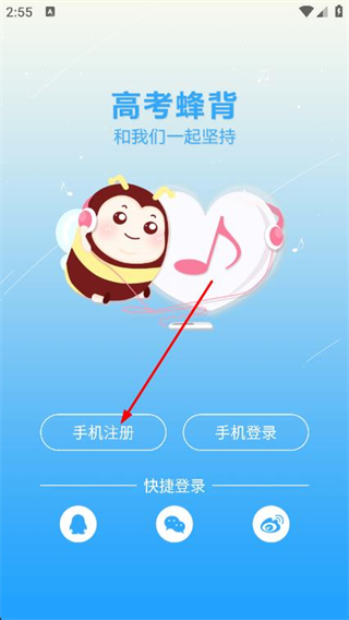 1、打開高考蜂背app,在首頁(yè)點(diǎn)擊手機(jī)注冊(cè)按鈕。
