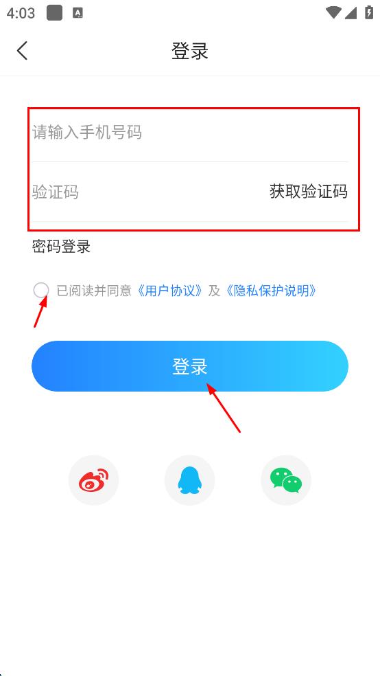 4、在登錄界面,輸入手機(jī)號(hào)碼,點(diǎn)擊“獲取驗(yàn)證碼”,將收到的驗(yàn)證碼填入,勾選已閱讀并同意相關(guān)協(xié)議,點(diǎn)擊“登錄”按鈕完成登錄。