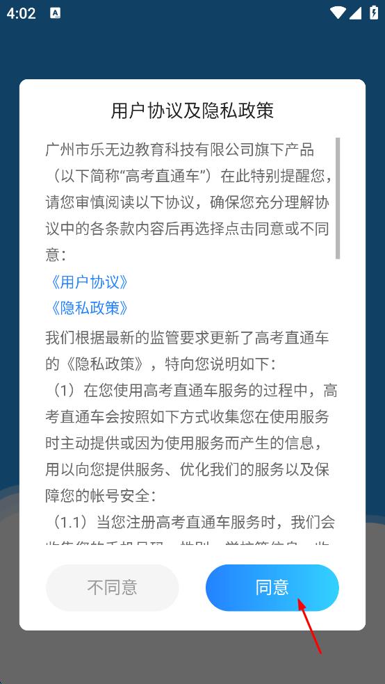 1、打開高考直通車APP,彈出用戶協(xié)議及隱私政策窗口,閱讀后點(diǎn)擊“同意”按鈕,進(jìn)入APP主界面。