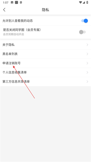 3、在隱私頁面點(diǎn)擊申請(qǐng)注銷賬號(hào)選項(xiàng),進(jìn)入賬號(hào)注銷頁面。