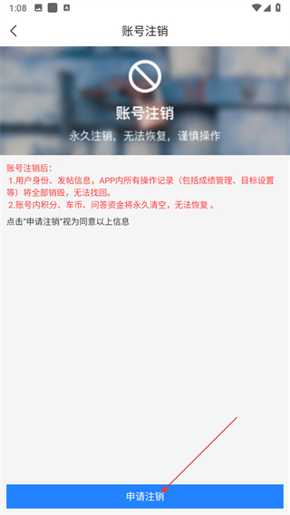 5、在彈出的賬號(hào)注銷說明頁面中點(diǎn)擊申請(qǐng)注銷,即可完成注銷。