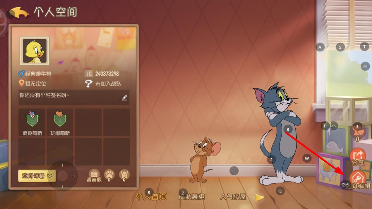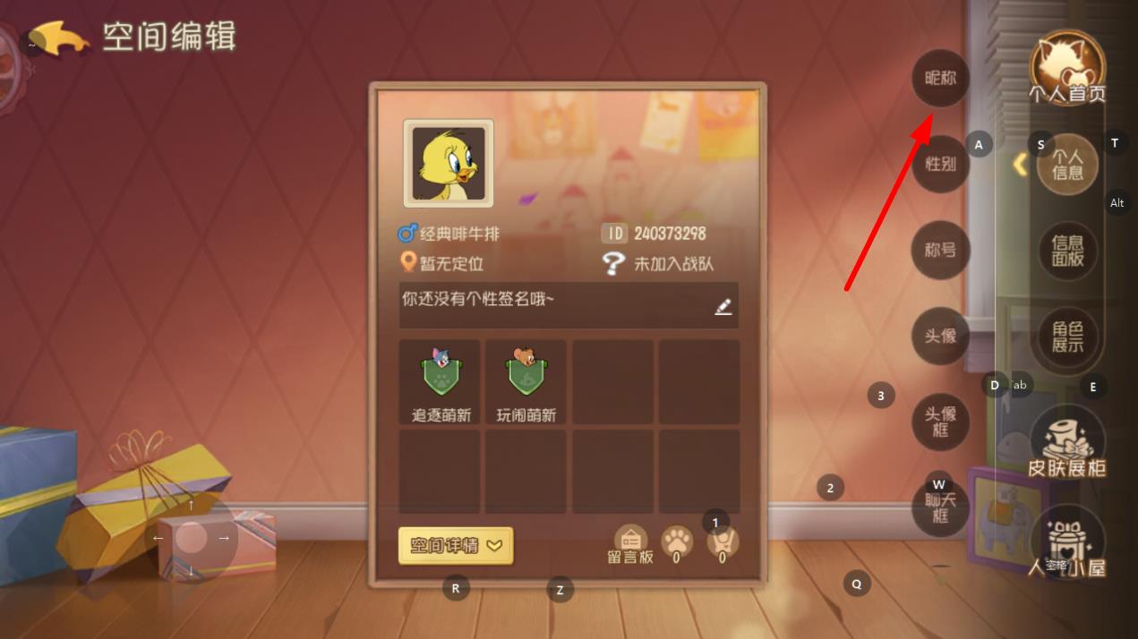 1、進入貓和老鼠游戲后,點擊左上角我的頭像,點擊游戲界面中的個人空間選項,進入到個人空間展示頁面。