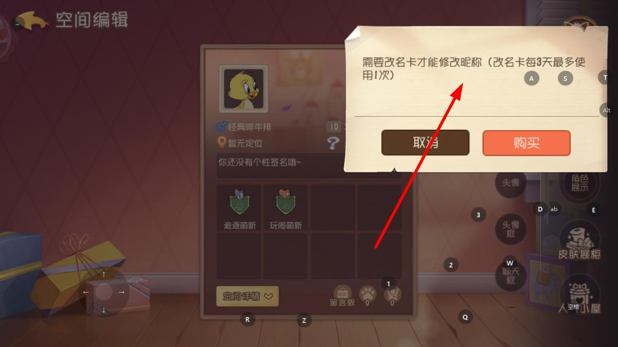 3、在空間編輯界面點擊右側的昵稱選項,提示需要改名卡才能修改昵稱,點擊購買按鈕獲取改名卡后即可修改名字,且改名卡每3天最多使用1次。